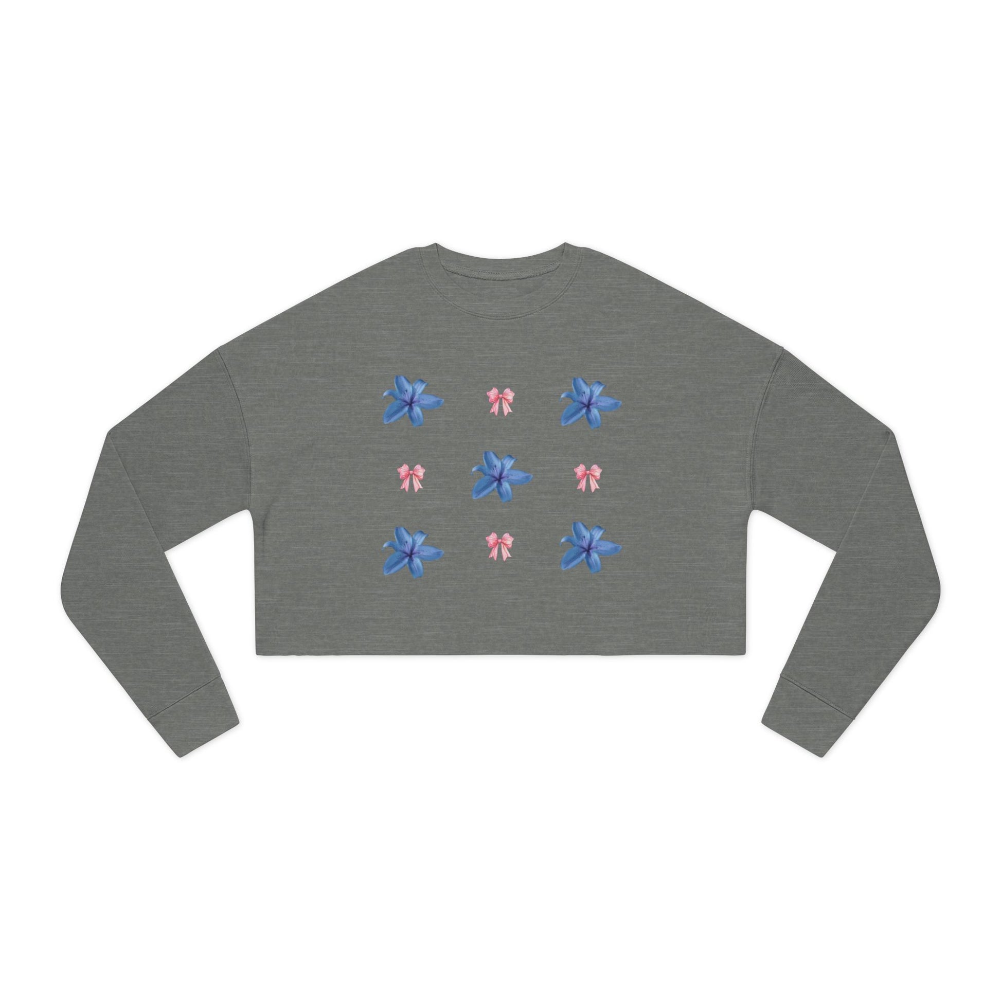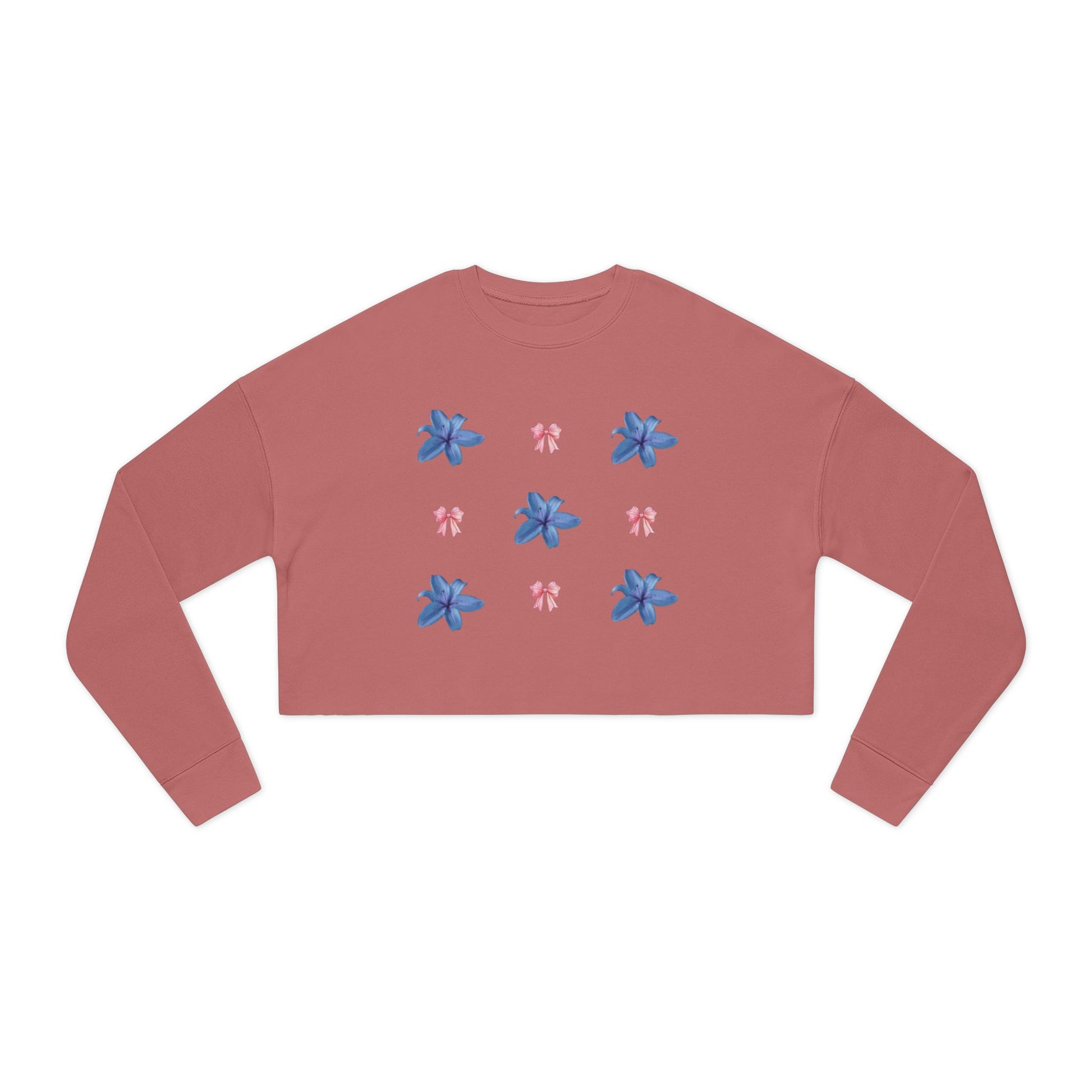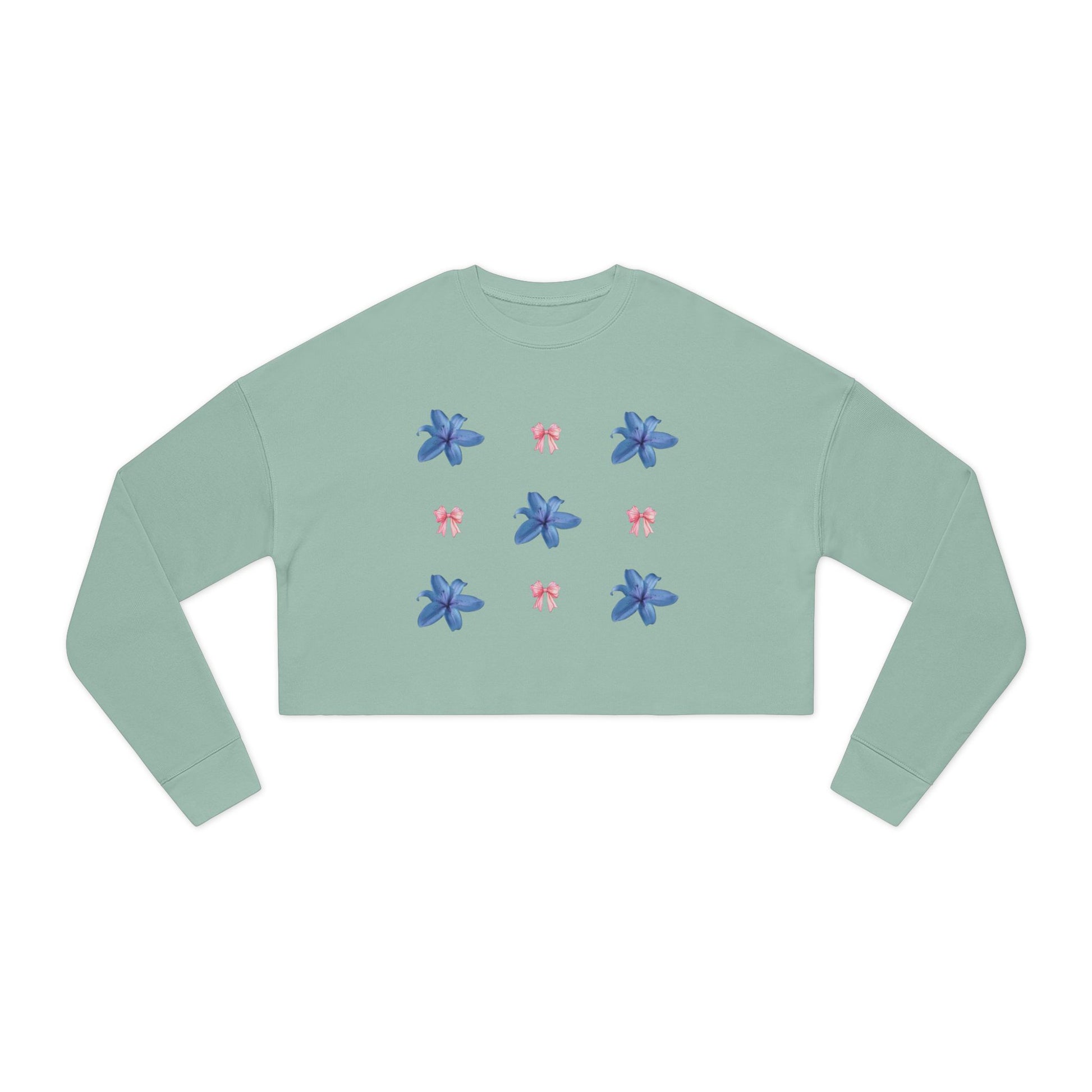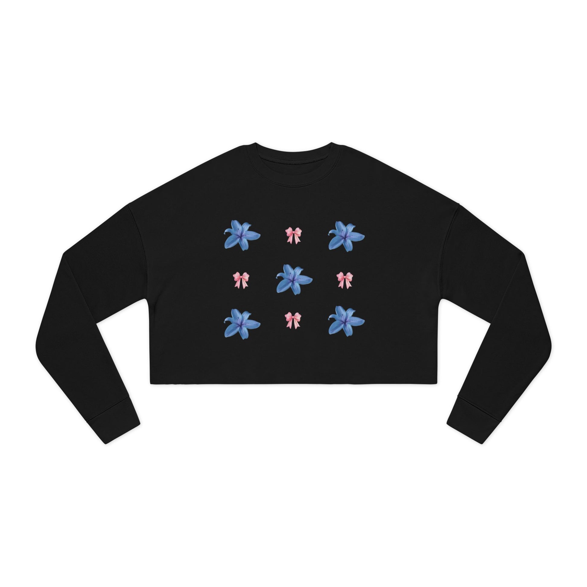 A soft, cropped sweatshirt that blends relaxed streetwear with a delicate, floral-feminine touch. The medium-weight fabric feels substantial yet gentle against skin, and the dropped shoulders create an easy, lived-in silhouette that layers effortlessly. Ribbed cuffs and collar hold shape while the raw hem gives the piece subtle edge. The back features a moody, painterly motif framed by small blue flowers repeated on the front — a quiet contrast that reads both artful and intimate. Wear it on slow mornings with high-waisted jeans or as a layered statement on cool evenings; it brings warmth without weight and personality without shouting.